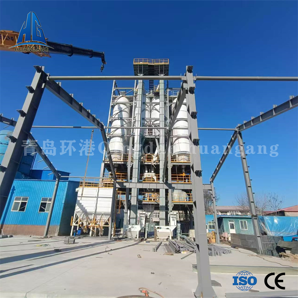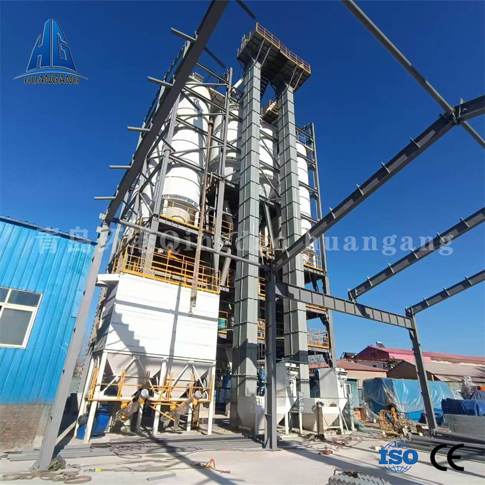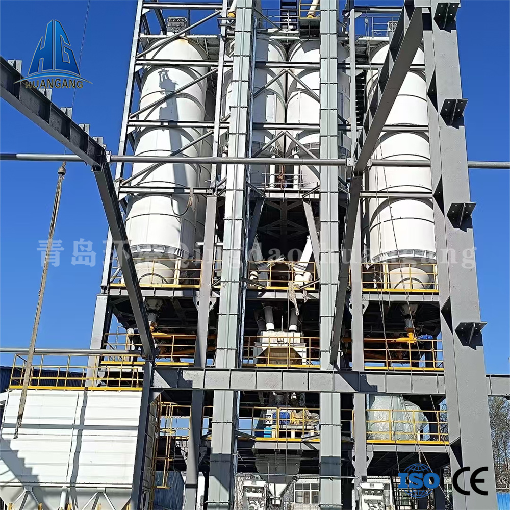 可配合干式制砂系統或者濕砂烘干系統,生產出優質高標準的干粉砂漿和特種砂漿。主樓采用塔式結構,將粉料倉安裝在主樓頂部,外加劑系統采用獨立平臺計量泵送。骨料自上而下經過計量層、混合機層、成品倉、控制室、散裝機、包裝機。