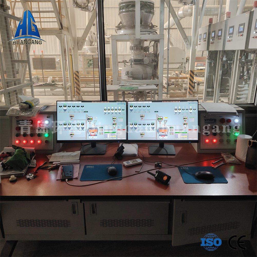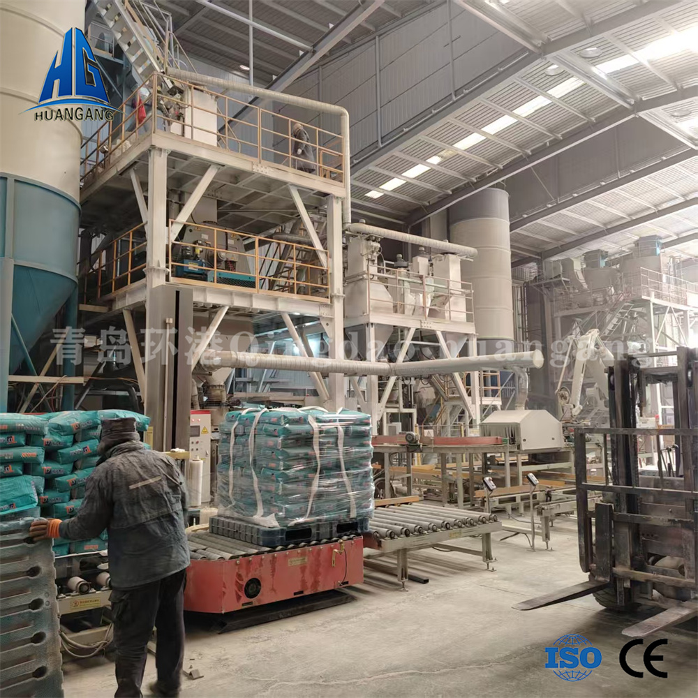 主控制系統依據選定工藝配方下達生產指令,系統自動從儲料倉中按配比提取原料,原料經配重后依次進入待混倉及單軸混合機,實現快速混合作業(3-5分鐘)。達到混合精度要求后,成品砂漿被輸送至成品倉,進入自動灌裝流程,新設計的自動包裝機按要求進行定時定量灌裝作業,大大提高產出效率,包裝好的成品被送至成品區堆放,等待出廠。